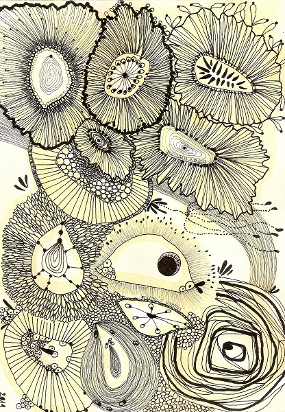 Drawing ink on saffron’s dyed paper, A5 format.