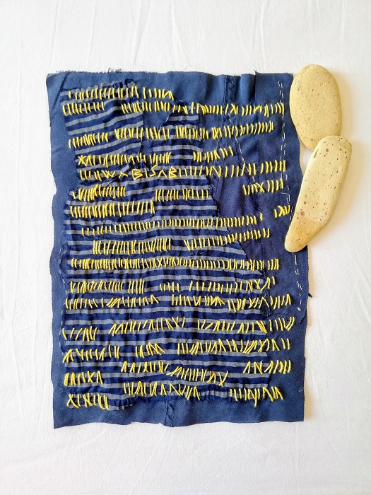 Queste 2 decorazioni da appendere sono fatte di due tessuti preziosi sovrapposti e decorati con impunture in filo di scozia e realizzate con la tecnica “asemic writing”. Compare decifrabile solo la parola “wabi-sabi”. Sono piccoli arazzi che possono essere appesi così “a nudo” oppure incorniciati in una teca. Lavate e lavabili in acqua a 30°.