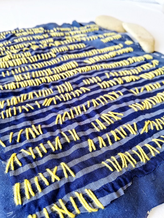 pura seta reused (blu a righe) + pura seta (blu) + filo di scozia avorio + giallo